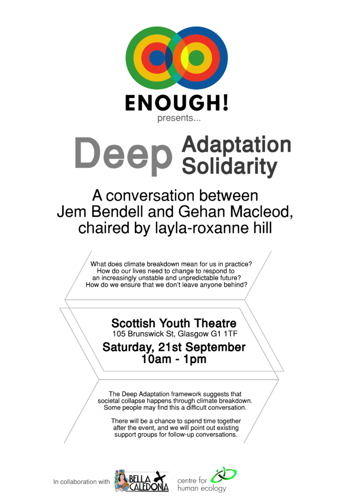 Jem’s paper ‘Deep Adaptation: a map for navigating climate tragedy’ predicts inevitable collapse, probable catastrophe and possible extinction. Hosted by Enough!’s layla-roxanne, Jem and Gehan will discuss the core themes of the Deep Adaptation agenda – resilience, relinquishment and restoration – with a view to social, environmental and racial justice, grounded in a Scottish and global context.