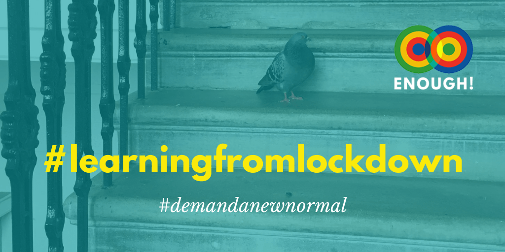 Share yours by using the hashtag #learningfromlockdown (hashtag which community you’re tweeting from) or share your thoughts on Enough’s #learningfromlockdown Facebook group.