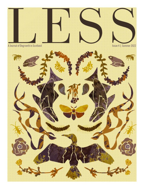LESS is a journal of degrowth, radical sufficiency and decolonisation in Scotland. LESS questions and challenges dominant narratives about what economic progress means in Scotland, and sketches out alternative visions. The focus is on collective and democratic solutions to sustaining livelihoods that meet people’s needs while rising to the threats of climate change, ecocide and mass extinction, inequality, racism and the far right, and the...
