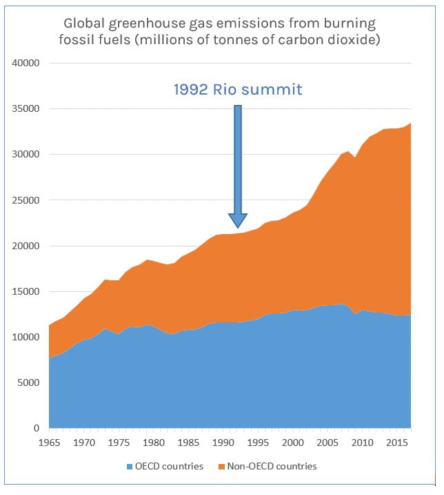 Greenhouse gas emissions from burning fossil fuels in 2017 were 56% higher than they were in 1992, a quarter century earlier, when the first international agreement to tackle climate change was made at the Rio summit.”